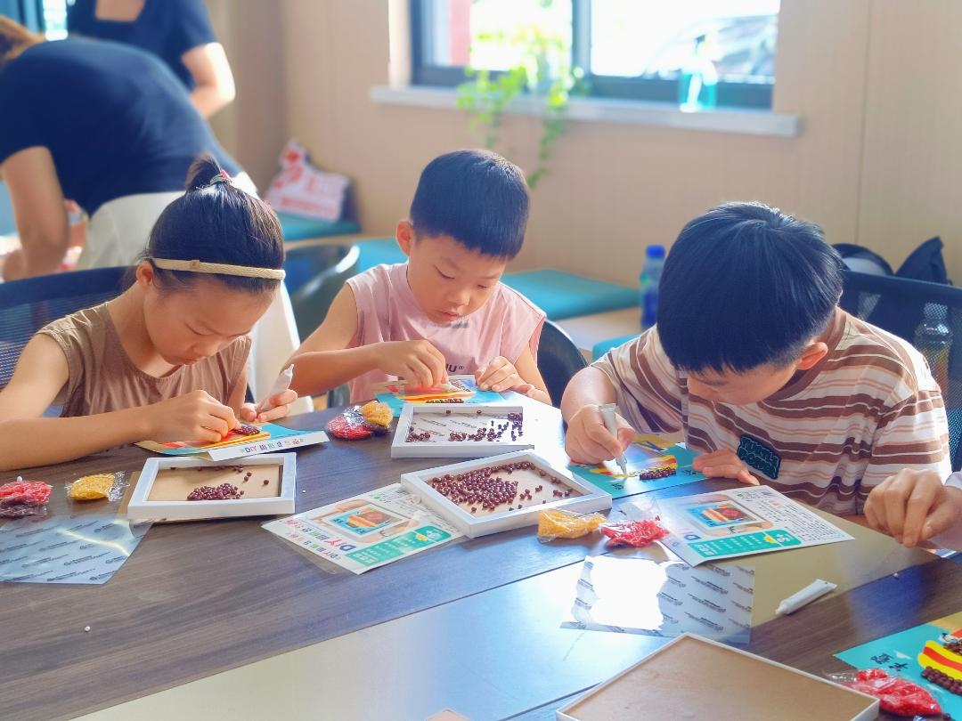 随后,活动进入了充满创意与乐趣的五谷拼贴画环节。在老师的悉心指导下,孩子们充分发挥想象力,动手实践。他们小心翼翼地将一颗颗饱满的红豆、一粒粒金黄的小米、一粒粒艳丽的红米等各色谷物作为“画笔”和“颜料”,专心致志地在画板上粘贴、创作。不一会儿,一幅幅充满童真童趣、展现秋日丰收景象的创意画作便跃然纸上。孩子们在亲自动手的过程中,不仅锻炼了专注力与创造力,感受到了农耕的辛劳与丰收的喜悦,更深刻体会到了“一粥一饭当思来之不易”的道理。