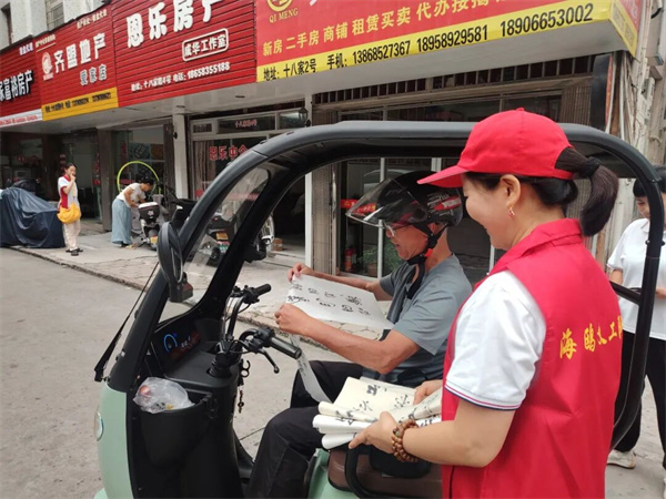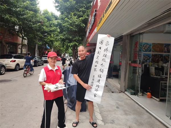 书画创作完成后,平阳县海鸥义工队的志愿者们迅速行动,携带这些饱含墨香的书法标语作品走上街头,向沿街商户、过往行人分发。志愿者们一边递出作品,一边耐心讲解垃圾分类的政策法规、分类标准及日常投放技巧,用生动的语言化解群众对垃圾分类的疑惑,鼓励大家从身边小事做起,主动参与分类实践。
