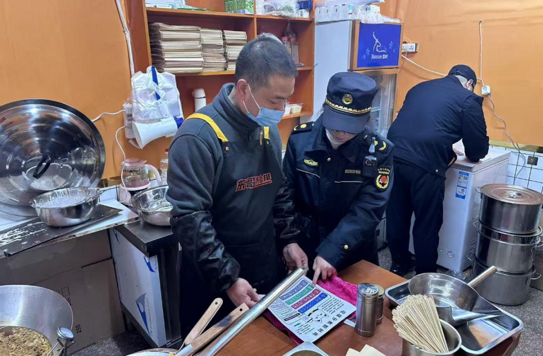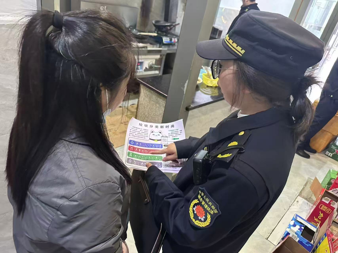 针对检查发现的问题,执法人员下达《责令限期改正通知书》,明确整改时限与标准,以及违法处罚等规定。同时,执法人员还发放图文并茂的宣传手册,结合餐饮行业经营特点,重点解读易腐垃圾沥干投放、外卖餐盒分类处置等高频问题,引导经营者建立内部自查机制。
