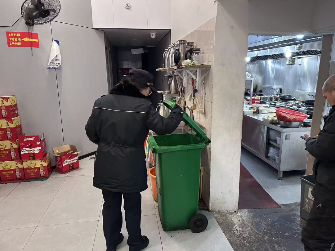 检查发现,多数餐饮商户分类意识显著提升,能按要求设置四分类收集容器并规范投放,但仍发现3家商户存在问题:其中2家后厨易腐垃圾桶未加盖、标识模糊,1家存在纸巾与剩菜混投现象。