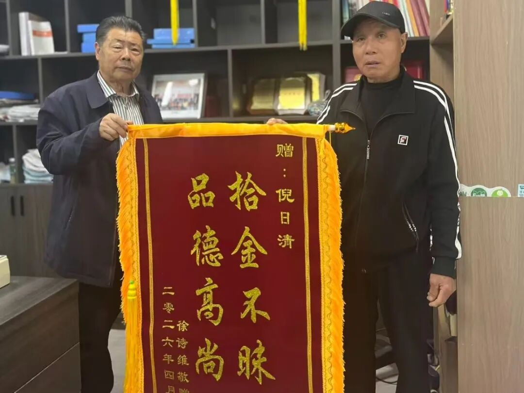 4月13日,平阳县万全镇市民徐先生带着将一面题写着“拾金不昧品德高尚”等字样的锦旗来到镇老年人协会,向倪日清表示感谢。