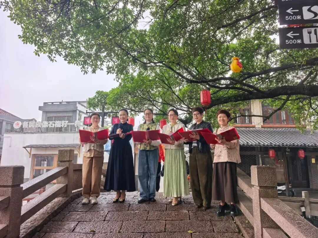 活动现场,学员们手持红色朗诵稿夹,精神抖擞、意气风发,分组伫立在古村石桥、榕荫树下,在清风与流水的陪伴下,深情朗诵《春暖花开》《春天的消息》等经典篇目。大家以饱满的情感、铿锵有力的语调,将春日的蓬勃生机与生活的幸福美好娓娓道来,既展现了朗诵艺术的独特魅力,更彰显出老年学员积极乐观、昂扬向上的精神风貌。过往游客纷纷驻足聆听,拿出手机记录这一温馨动人的瞬间,现场氛围热烈而祥和。“把课堂搬到风景如画的鸣山村,在园博盛景里感受古村韵味,朗诵起来更有感情、更有感染力!”参与活动的学员由衷感慨。此次户外朗诵课,打破了传统课堂的空间限制,是昆阳镇老年学校创新教学模式的一次生动实践。学员们在沉浸式体验中提升了朗诵技艺,同时也用声音为鸣山村的生态人文之美代言,让园博绿色理念与乡村传统文化在春日里碰撞出别样火花。